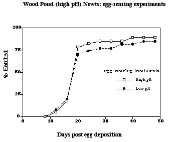 In order to address this question, we have begun to raise newt eggs from newts of the two different pH ponds in water of different pH. For example, during the summer of 2000, we brought newts from Wood Pond (high pH) into the lab and got them to breed. We then reared those eggs in water with either a high pH (pH=8) or a low pH (pH= 4.5). There was a small difference in hatching success of the two groups of eggs: 89.2% for eggs reared in high pH and 84.4% for eggs reared in low pH water. These data are only preliminary.