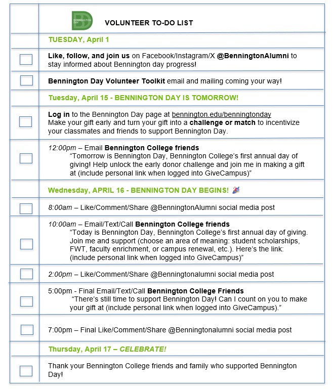 Thank you for your gift! Become a Bennington Day Volunteer and access this toolkit with more information on how to spread the word with your classmates, family, and friends.
