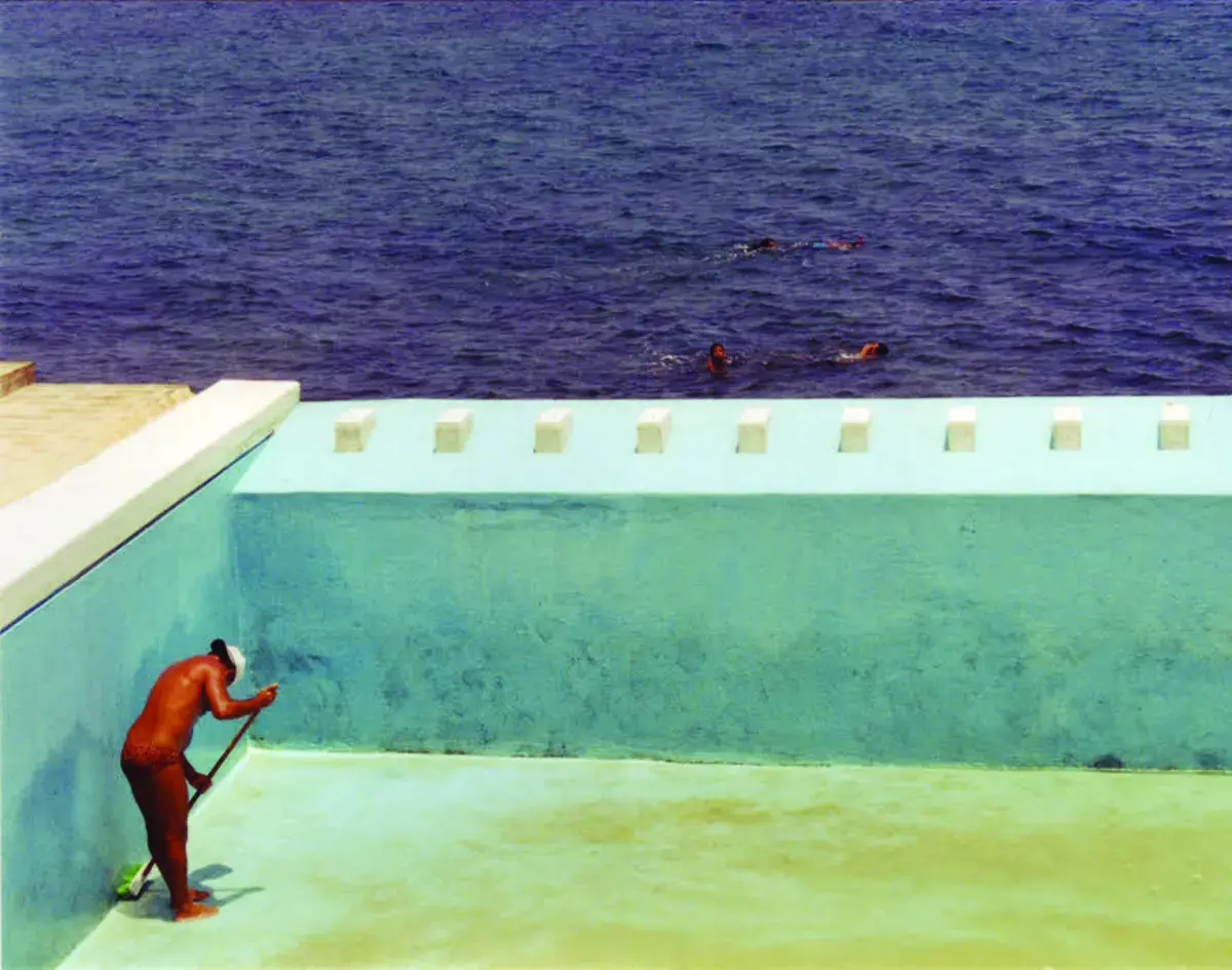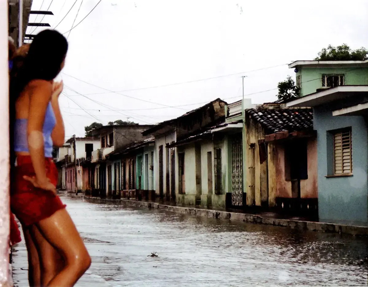 I have traveled to Cuba since 2001 and have witnessed the extraordinary role that water plays in everyday life on the island. I have been particularly struck by the ways water can’t be controlled and how the people in Cuba adapt to this. In cities and homes, plumbing often goes awry: water disappears in the middle of a shower; toilets won’t flush and then suddenly explode. Everywhere on the island, people are at the mercy of the rain and the weather in a way that offers little escape. In these photographs from a series taken on Kodak film, I documented the role water or the lack of it affects the habits of life in Cuba. In Miramar, Havana, a man sweeps an empty pool, while swimmers enjoy the sea beyond him. In Nuevitas, two girls are stranded in a rainstorm, chatting casually as the street becomes a river and halts all travel.