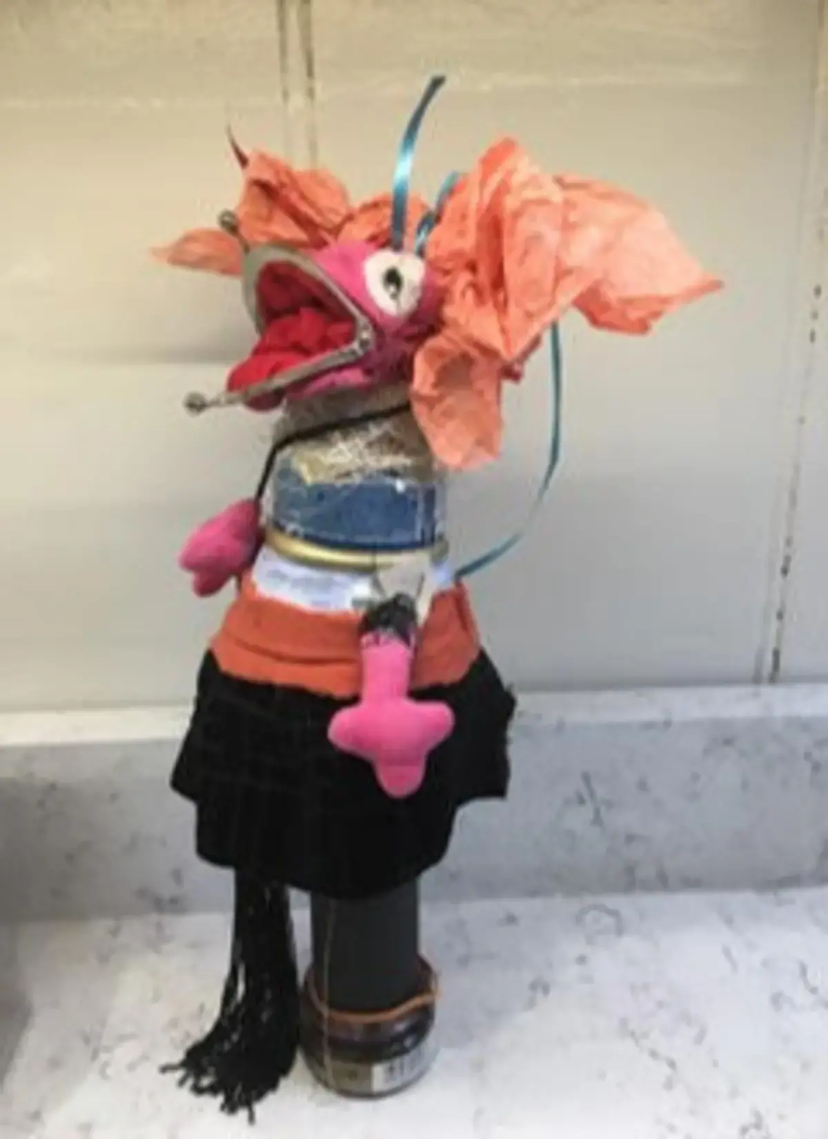 When Jaqueth encounters a creative block, she goes to the trash and makes sculpture out of everyday found materials. This is one of her “Trashers.” (Right)