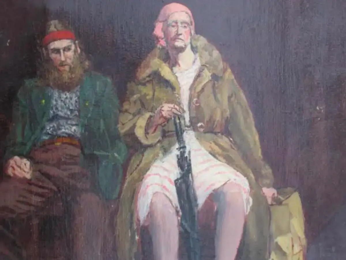 Left: Tenderloin Arty Lending Library (TALL). Right: Transgender Lady with Young Hippy Lover at the Bus Stop, oil on canvas, 14" x 12" by Robert Honig.