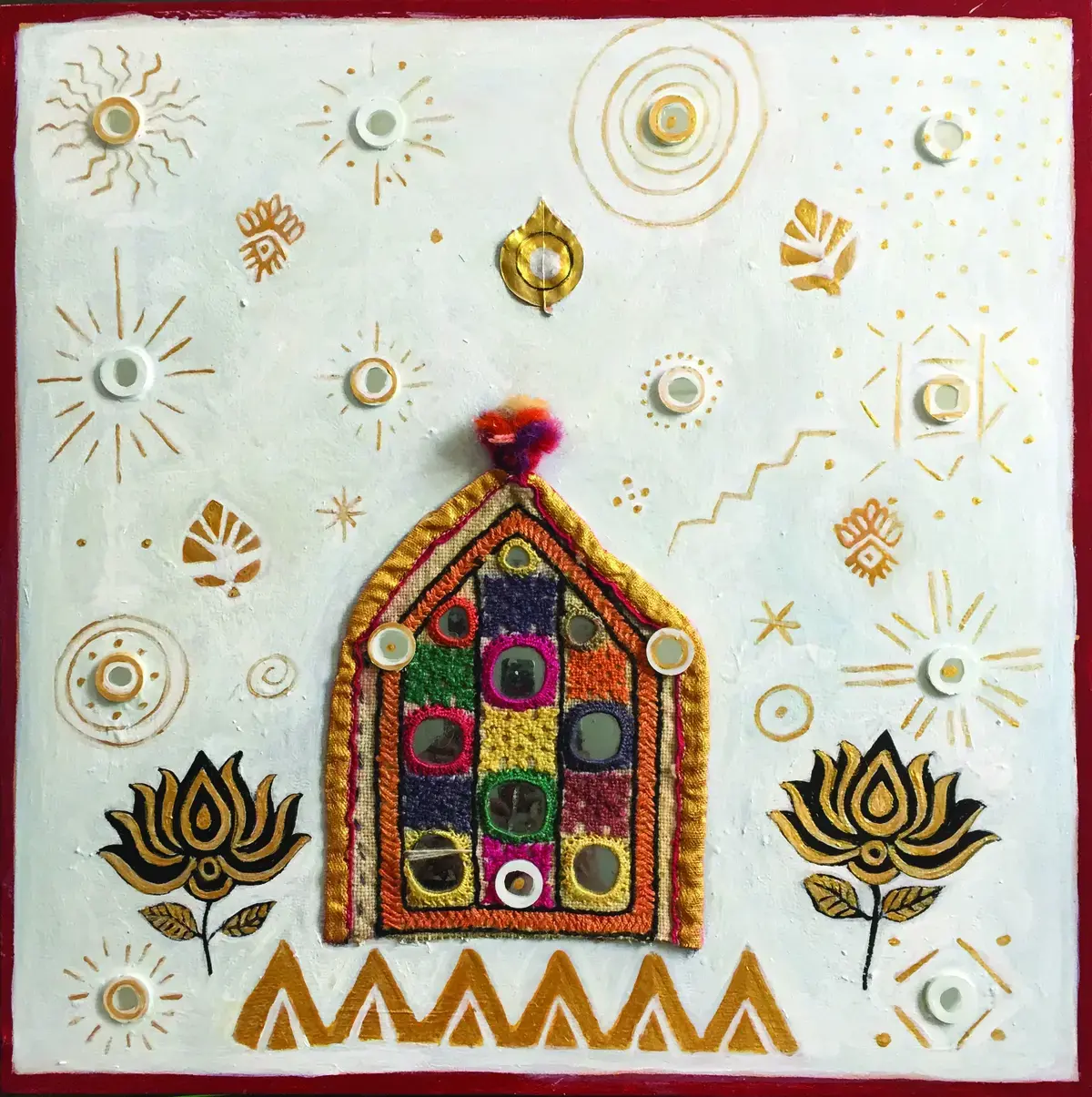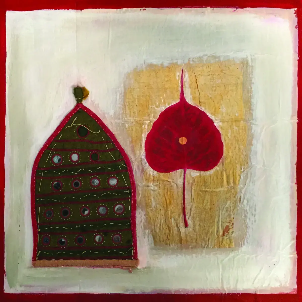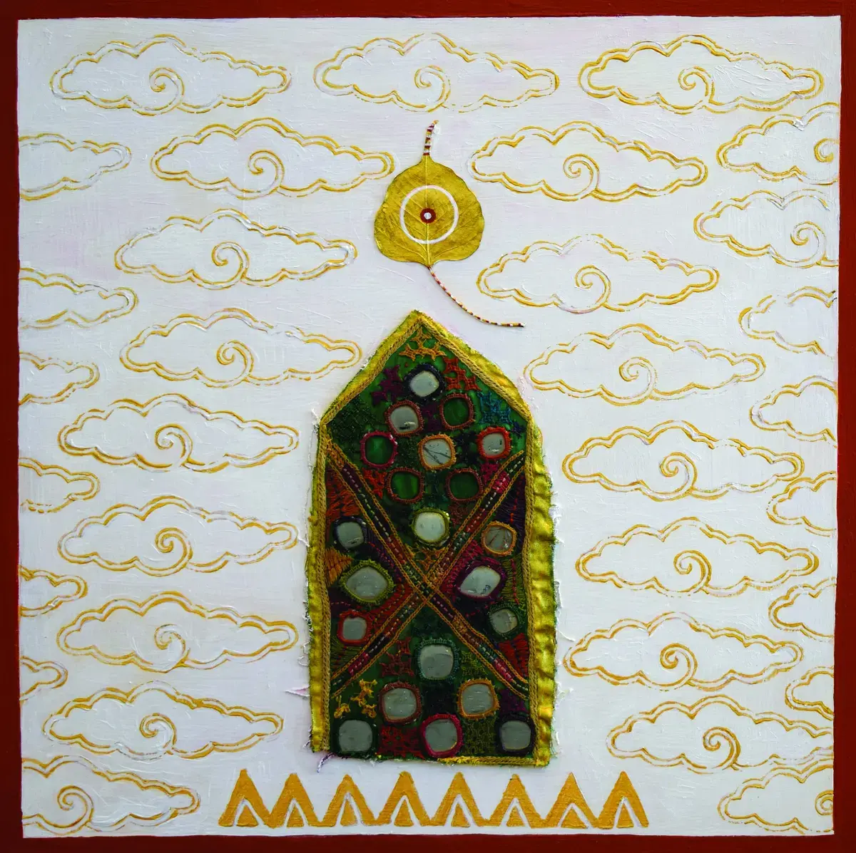 These pieces were inspired by traditional Tibetan Buddhist thangka paintings and my travels to Nepal and India, where I studied at a monastic art school and set off on a pilgrimage to important Buddhist sites. The works reveal melodic fusions of the eastern and western traditions and techniques of art, as an expression of my multicultural identity. Although there are many eastern aspects to these works, they are western and contemporary in execution. Each piece from this series has a leaf from the bodhi tree at the Mahabohi Temple where Gautama Buddha attained enlightenment.