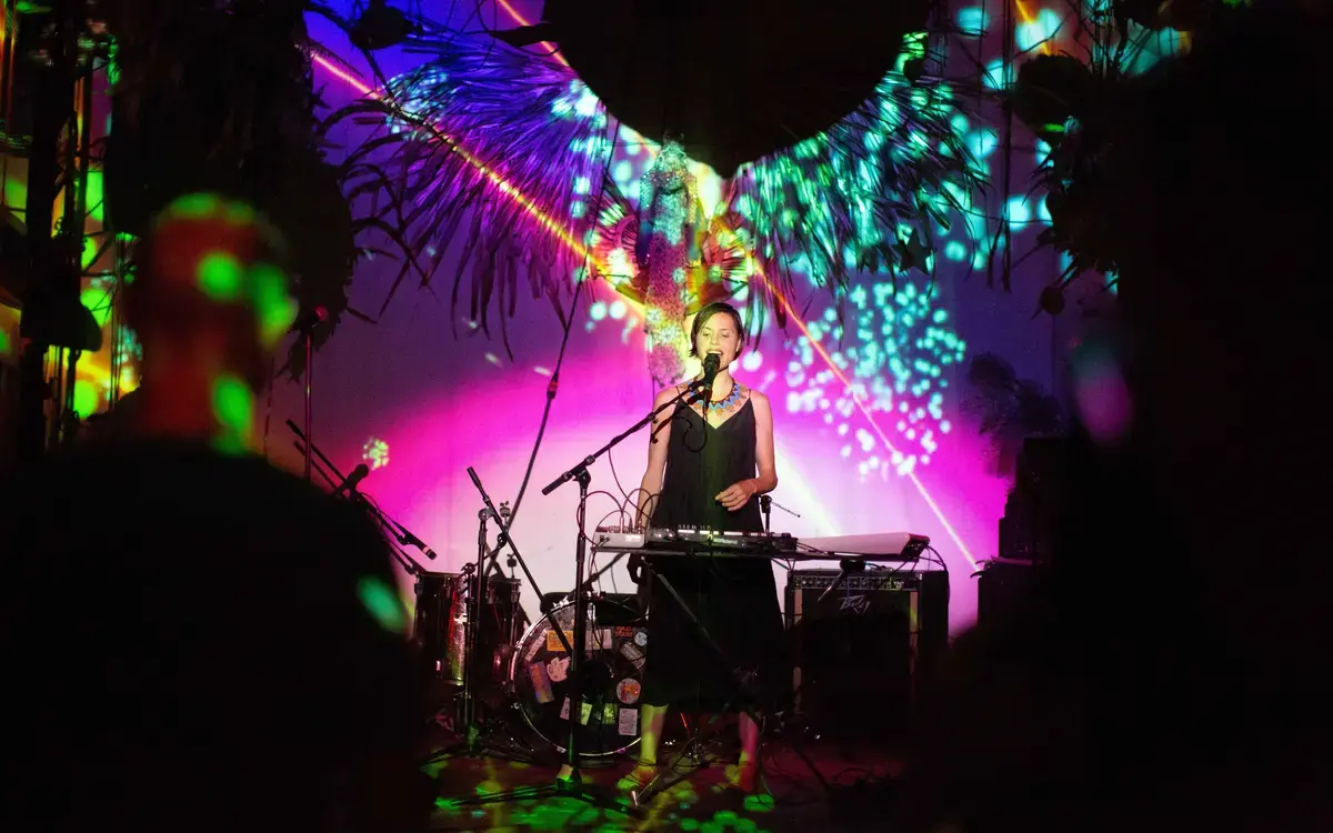 Pictured: Singer Mira Cook performing at Rubulad. Projections by the Sperm Whale. Photo: Briee Della Rocca.