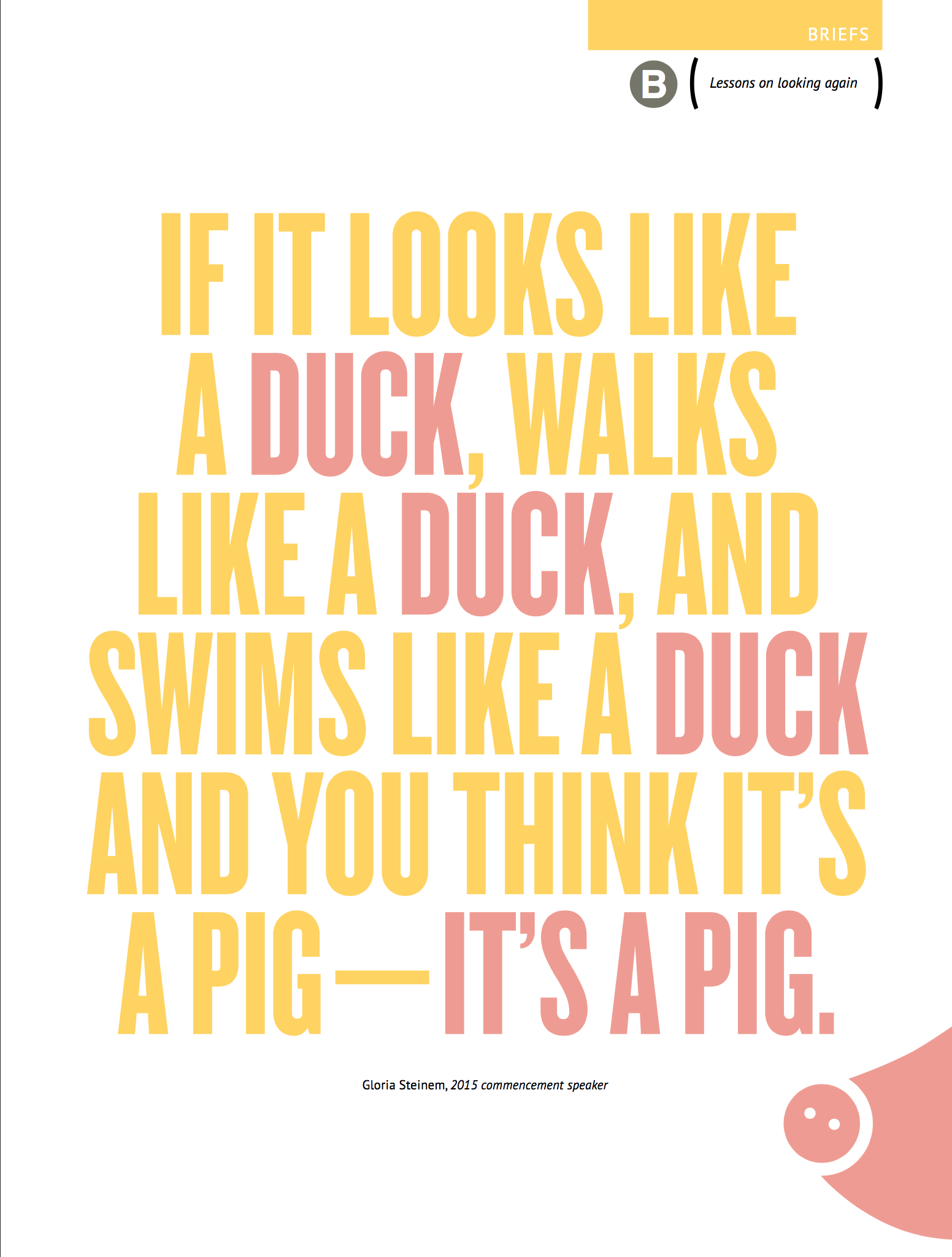 In putting this issue together, I had the wisdoms of commencement speeches past and present to inspire me: Gloria Steinem and faculty member Sherry Kramer. Each speech should be read (or watched) in the fullness with which it was delivered, but for the purpose of this issue I am, forgive me, putting their ducks in a row. Ducks, which have come to mean for me a way of being and seeing. This issue of Bennington is threaded with stories about being and seeing—from a cacophonous social telling of Bennington’s 24 Hour Plays to the stories about new ways to start political and social revolutions (p. 22 and p. 25) as well as the little heard stories of women in history (p. 16) and those of the scarcely seen in war zones (p. 38) that would go untold if not for award-winning alumni writers Megan Mayhew Bergman MFA ’10 and Luke Mogelson ’05.