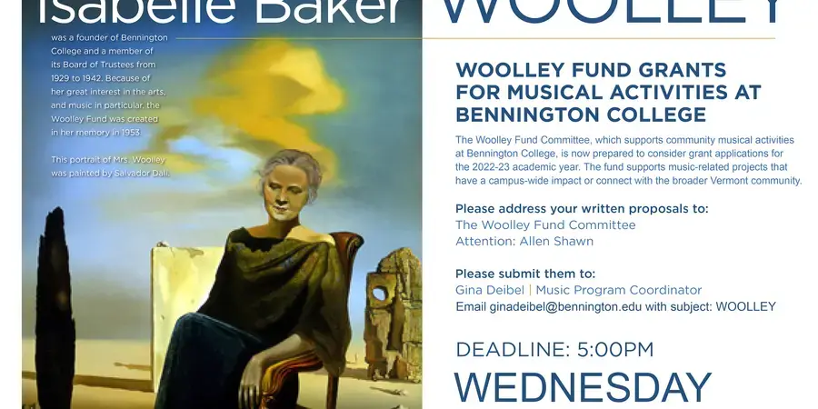 It is the purpose of the Woolley Fund to enrich the musical life and experience of the Bennington community by stimulating and supporting musical projects. Isabelle Baker Woolley was a founder of Bennington College and a member of its Board of Trustees from 1929 to 1942. Because of her great interest in the arts, and in music in particular, the Woolley Fund was established in her memory in 1953. Please address your written proposals to: The Woolley Fund Committee, Attention: Allen Shawn, committee chair. The deadline for submissions is Wednesday, March 8, 2023 at 5:00 pm.