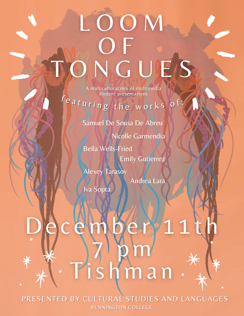 OPEN TO THE PUBLIC | Bennington students read, perform, and show a variety of creative works in progress that revolve around their unique and diverse responses, interventions, and approaches to the literary, artistic, cultural, and historical artifacts from a wide array of languages and cultures, including Spanish, Serbian, and Russian.
