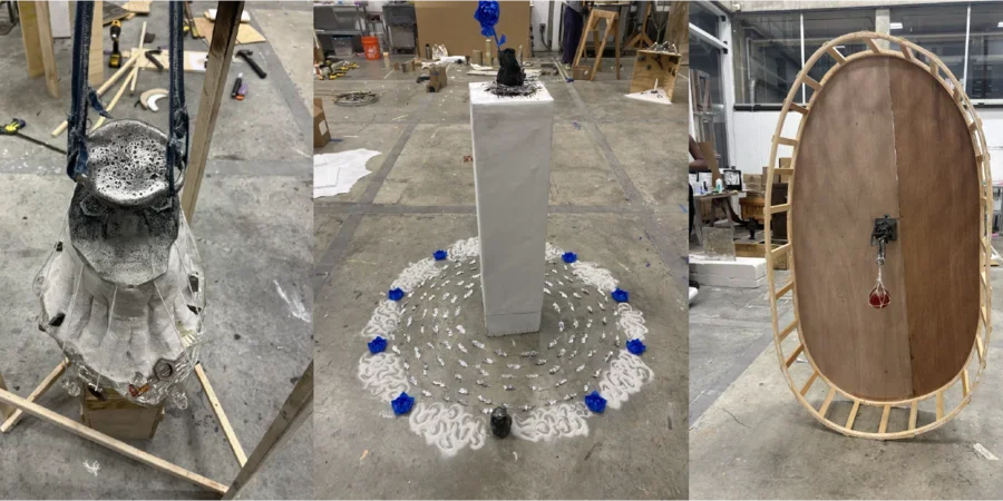 OPEN TO THE PUBLIC | This is an exhibition titled after the project prompt: delicate in tension (DiT). This show consists of work from a Sculpture class titled Examining Space, taught by John Umphlett, that showcases the work of 19 students. This show highlights the experiences and challenges of participating in an iron pour and working with glass off campus. The students' project was to bring both of these experiences together in the form of an installation that somehow spoke about themselves and their personal translations directly relating personality to material properties. The project also included the many materials involved in the processes of casting iron and working with glass, graphite, plywood, wax, baby powder, aluminum foil, silbind casting resin and sand. The idea was to connect the experiences and have this takeaway object made of the end focused material (glass and iron), but at the same time recognize and develop the installation to incorporate connected and assistant materials. To recognize and understand that all parts and experience and assistance of refining a focus are just as valuable in the end. “We all are part of a larger whole,” Umphlett states.