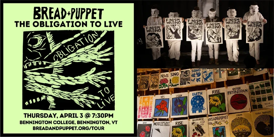 OPEN TO THE PUBLIC | The iconoclastic Bread and Puppet Theater returns to Bennington College! Peter Schumann’s legendary carnival of dissent and other possibilities will be stopping by VAPA's Greenwall Auditorium on Thursday, April 3 on their spring 2025 tour, "The Obligation to Live".