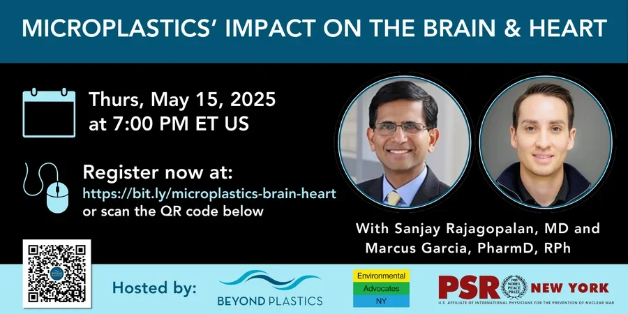 OPEN TO THE PUBLIC | Recent studies have found small fragments of plastics known as microplastics in the human brain and heart arteries. These studies have also shown a link between the presence of microplastics and adverse health outcomes. How do these tiny bits of plastic enter our bodies and make their way into our brains and our hearts? And what happens when they lodge there? Join Beyond Plastics, Physicians for Social Responsibility - NYS, and Environmental Advocates of New York for a free educational webinar on these questions with Dr. Sanjay Rajagopalan, a physician scientist whose work has helped transform global perceptions and understanding of the impact of environmental risk factors on cardiovascular disease and Marcus Garcia, PharmD, RPh, University of New Mexico Medical School, co-authors of two ground-breaking recent studies on the presence of microplastics in the human heart and brain.