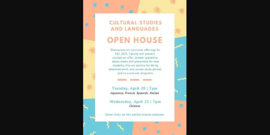 The individual language programs of the Cultural Studies and Languages discipline invite you to an Open House to discuss curricular offerings and choices for Fall 2021. We will present courses on offer, answer questions about levels and placement for new students, discuss options for doing advanced work, and survey study abroad and co-curricular programs. We hope you’ll come with questions. If you are interested in more than one language, please feel free to drop in for a bit and move on to other language sessions.