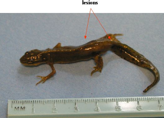 For the last several years, we have noticed odd subcutaneous lesions in some newts at various field sites. We have begun attending to the incidence of these lesions in earnest and over the last three years, roughly 40% of the newts from one pond appeared to have them.