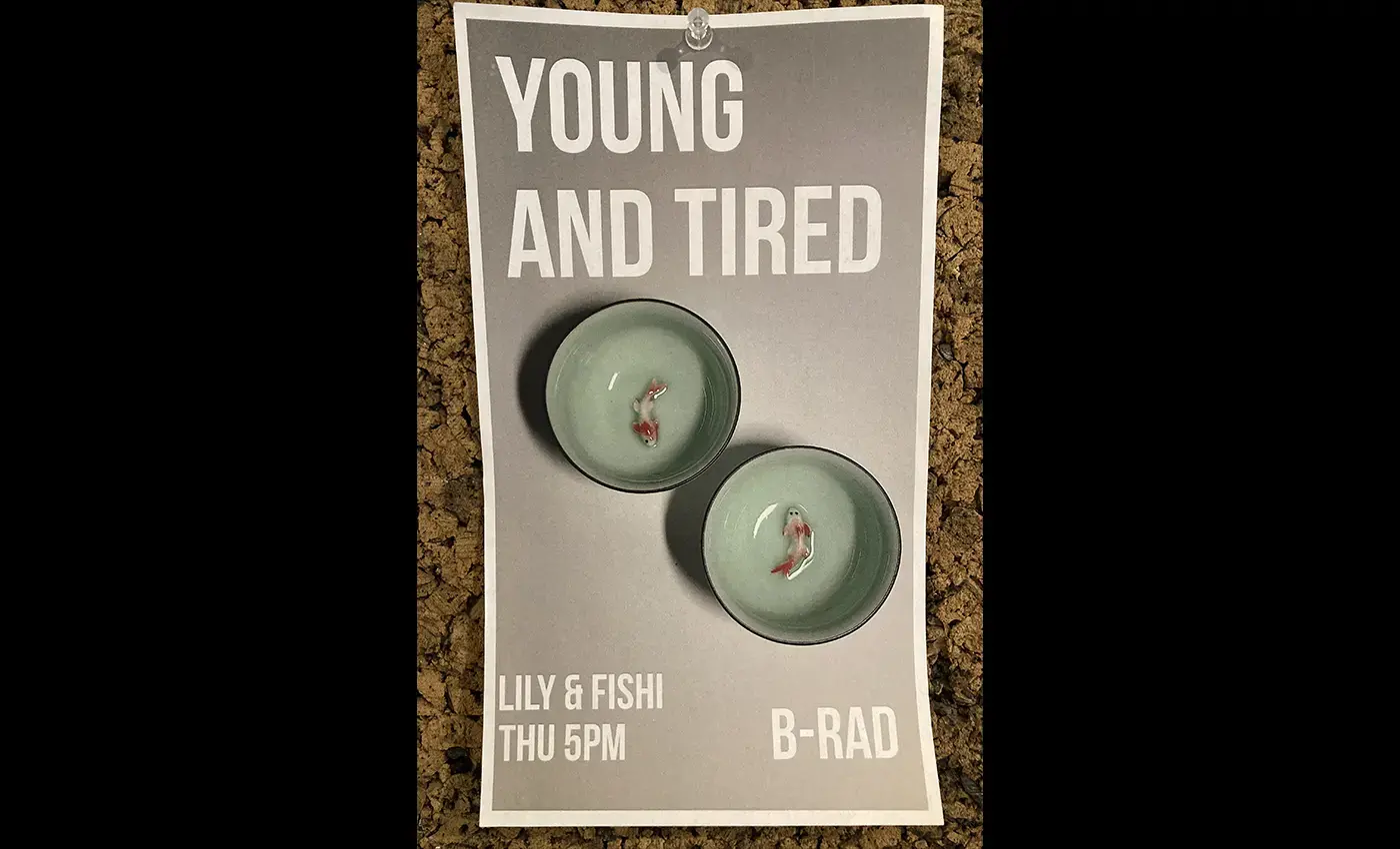 The high-ceilinged room has been transformed into a studio. Its back wall is covered with a white board. Multicolored doodles bear some resemblance to the hand-drawn B-Rad posters that hang near the entrances to buildings all over campus.