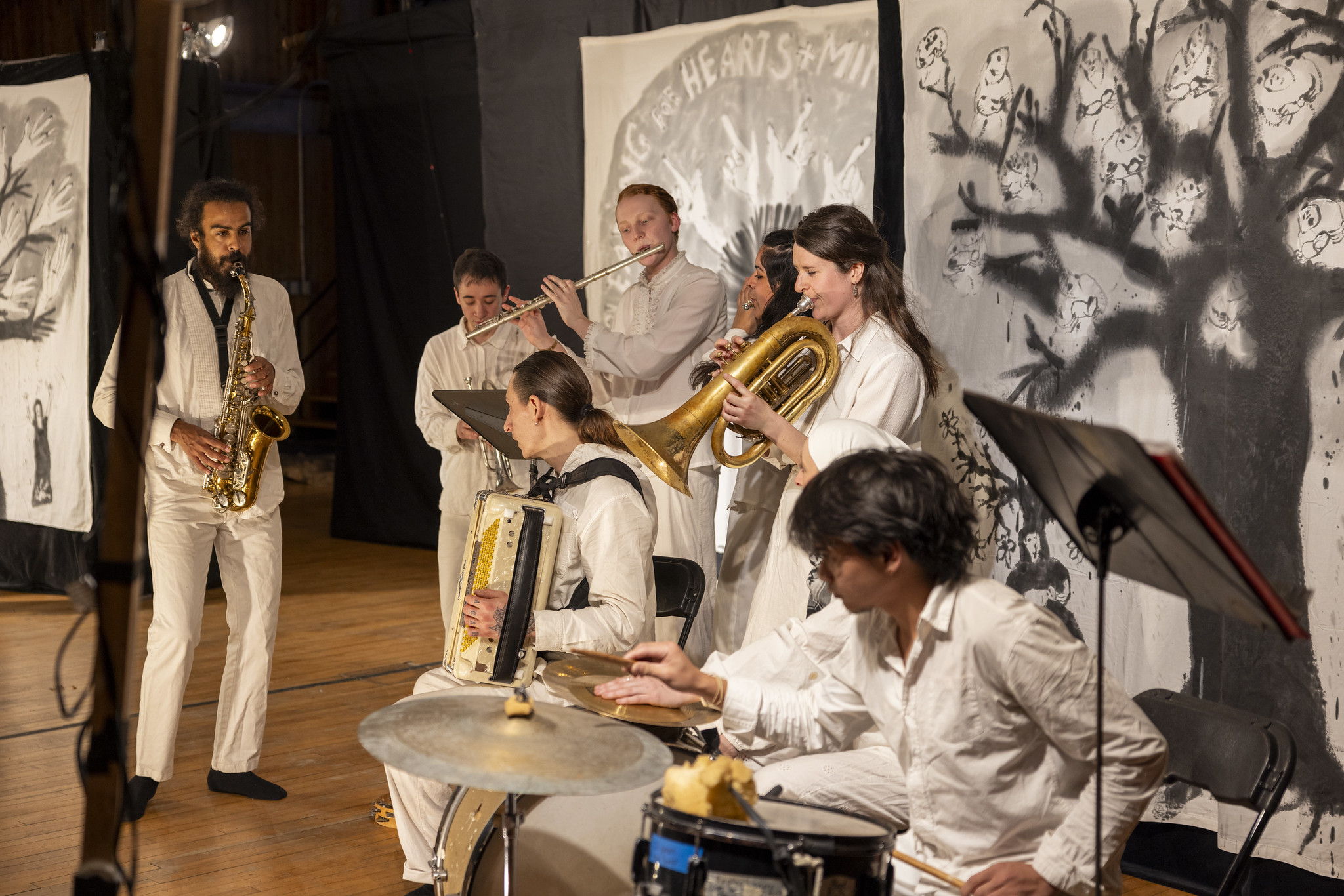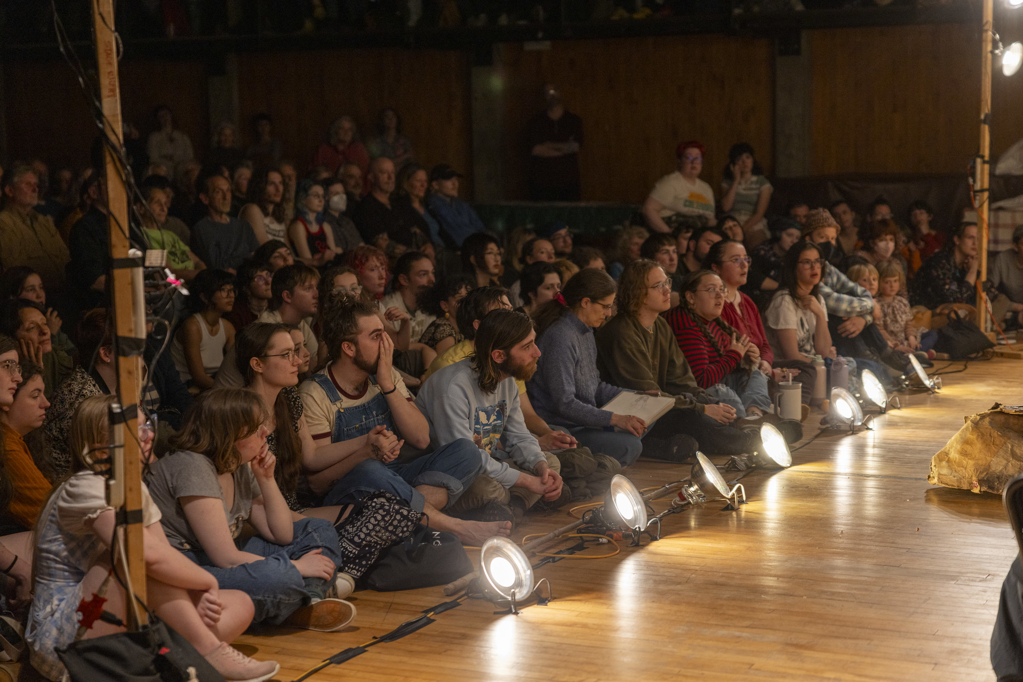 "The best seats are on the floor," one of the performers shouted between the musical prelude and the performance, called Obligation to Live. "Don't be shy," they boomed. Many left their seats and streamed to the front.