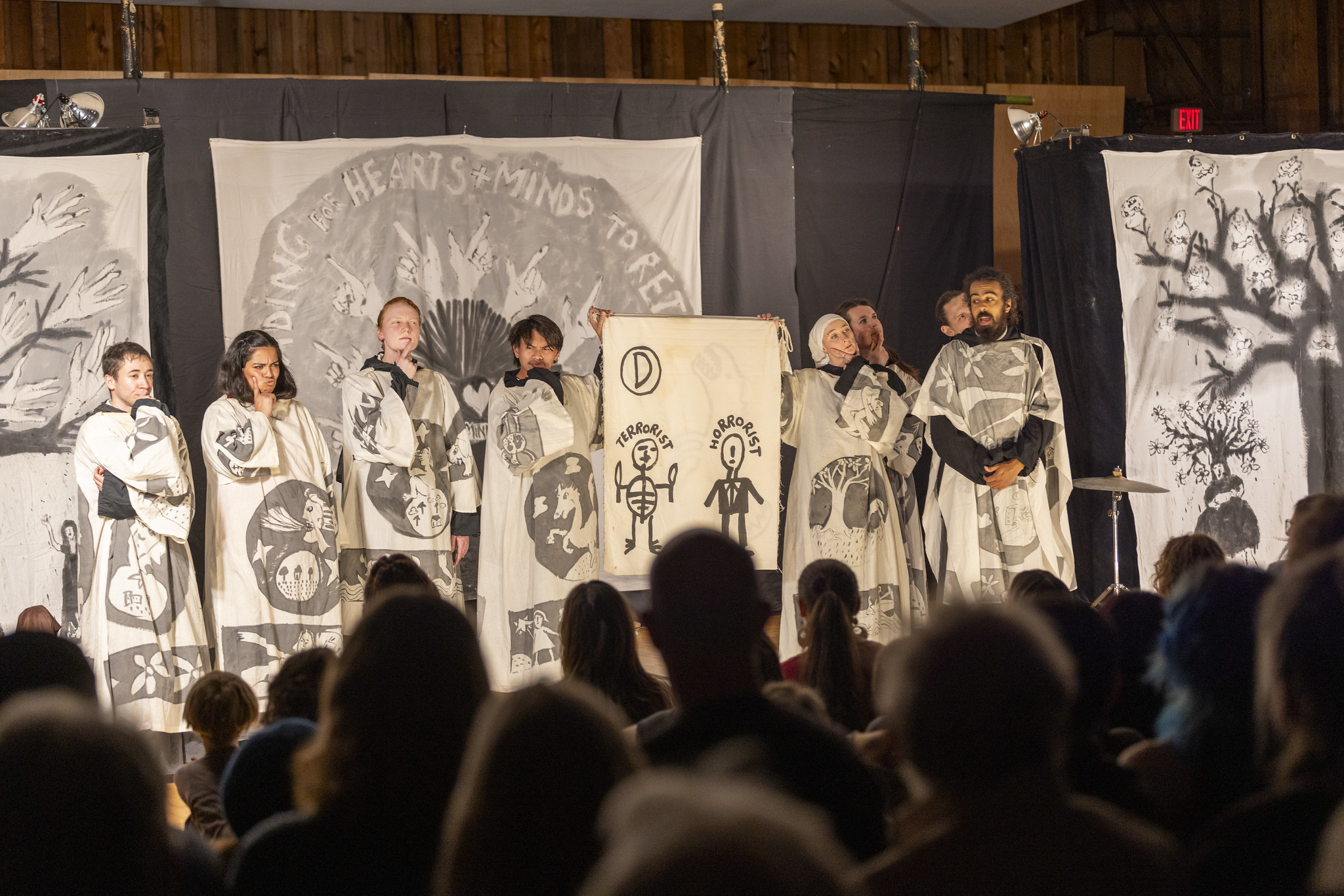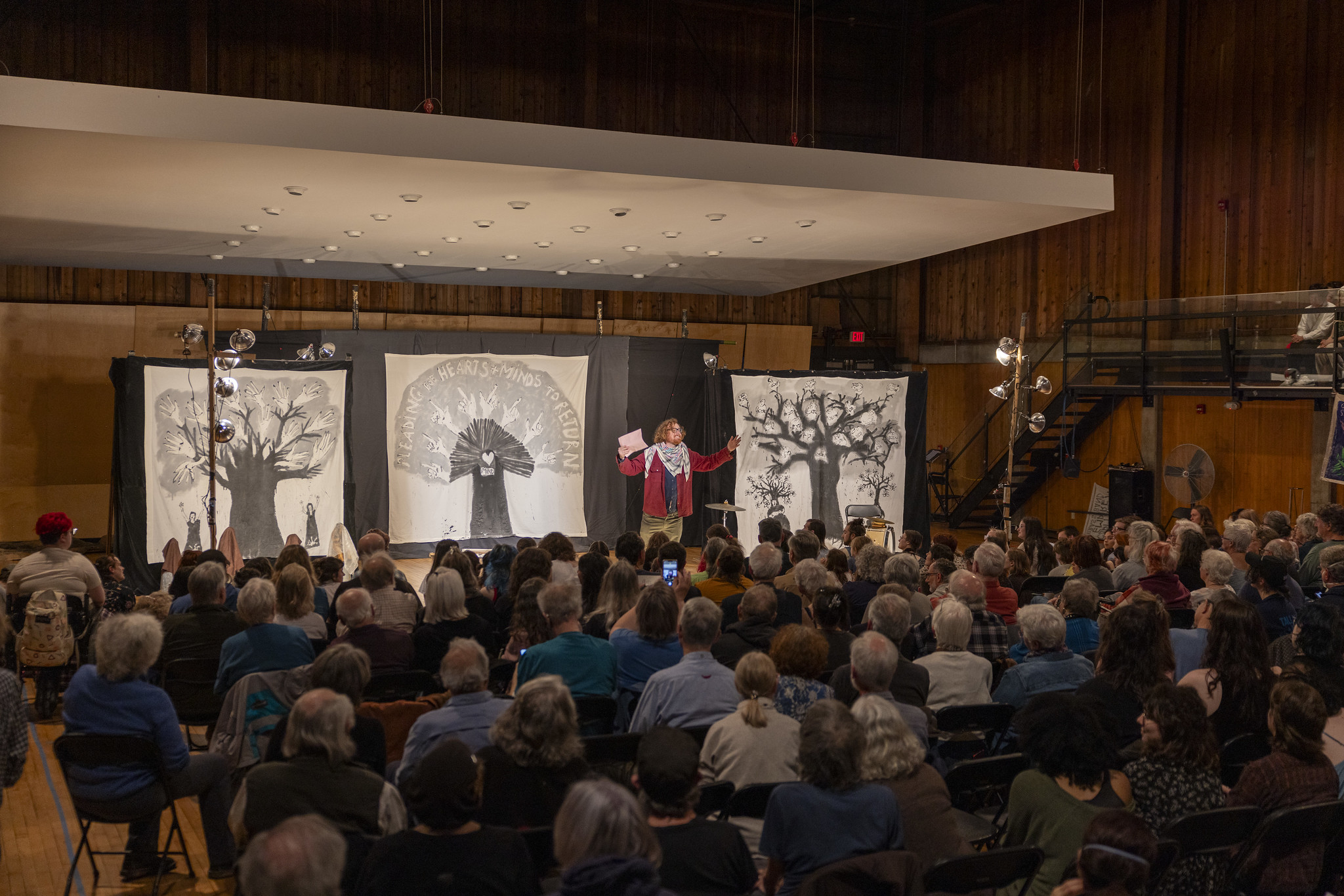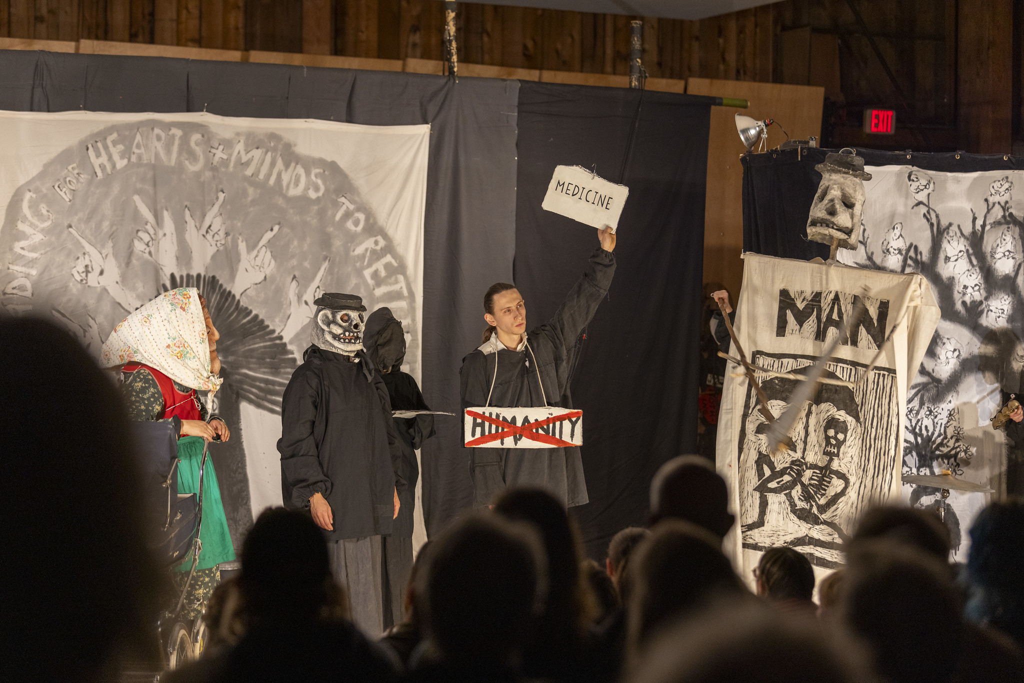 Greenwall Auditorium was full to busting when eight performers from Bread + Puppet Theater took the stage on the evening of Thursday, April 3. Students and community members filled the rows of chairs and the balconies along both sides and the back of the room. Students climbed steep ladders to catwalks high above the crowd and let their feet dangle.
